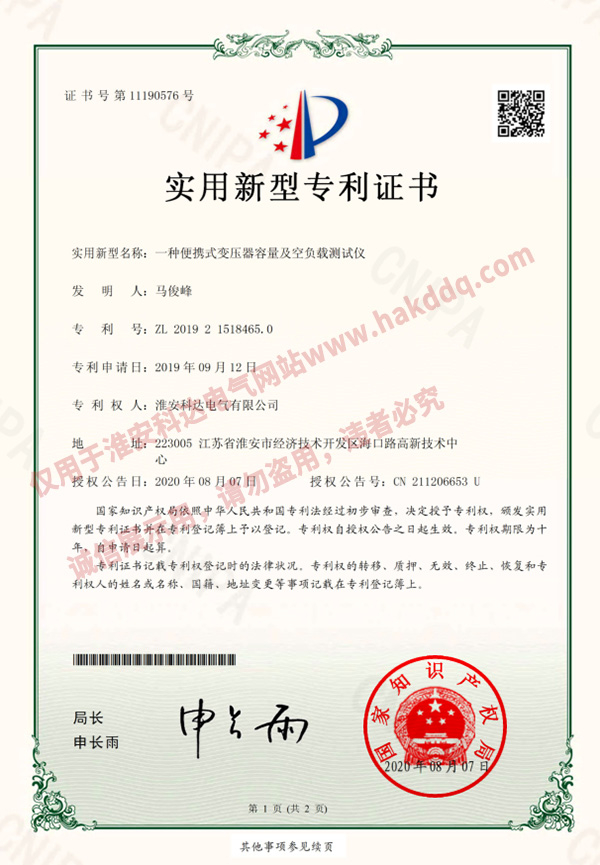便攜式變壓器容量及空負(fù)載測(cè)試儀專利證書(shū)