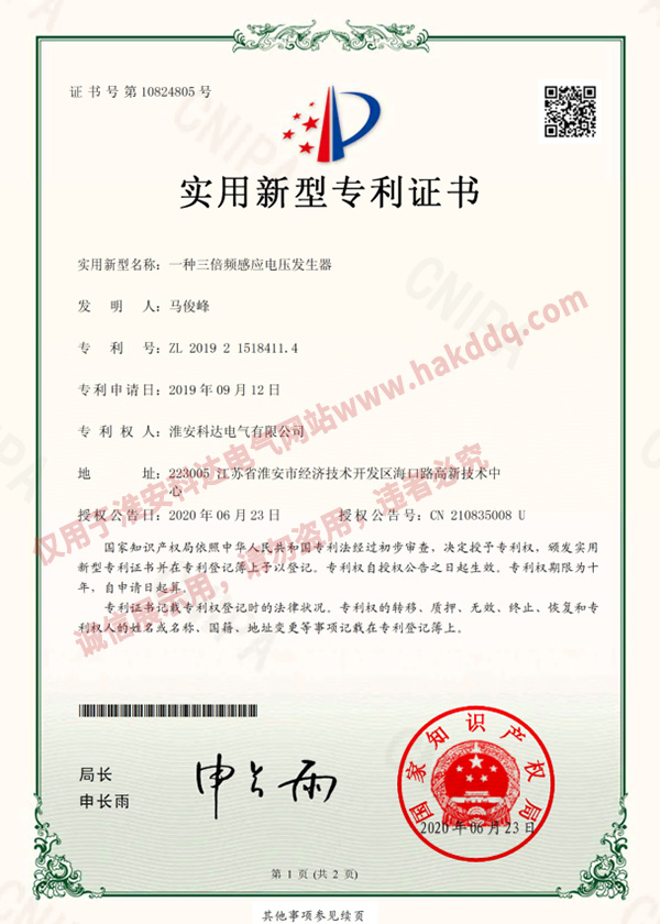 三倍頻感應(yīng)電壓發(fā)生器專利證書